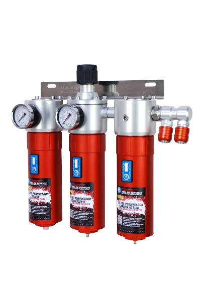 The Sagola 5300X filter offers the maximum filtration level in spray booths and painting lines where finishing is highly demanding. Three filtered stages, Sinterised brass 8 microns pre filtration is incorporated, followed by a 0.01 micron Coalescent filter and final filtration by a wide surface active charcoal filter. Ideal for waterborne painting lines (and organic vapor problems in the network). This model eliminates, in addition to water and impurities, organic fumes and foul air