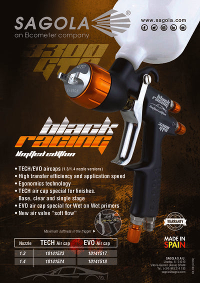 Introducing the Sagola 3300 GTO Black Racing Limited Edition! This sleek and high-performance spray gun combines style with precision. Designed for automotive enthusiasts and professionals, it offers unparalleled control and exceptional results. Based off the 3300 GTO, this upgraded version provides more control, ergonomic & custom design to improve your paintwork. Elevate your painting experience with its unique black racing design and top-notch functionality. Get ready to spray with style and confidence! For basecoats & clears.